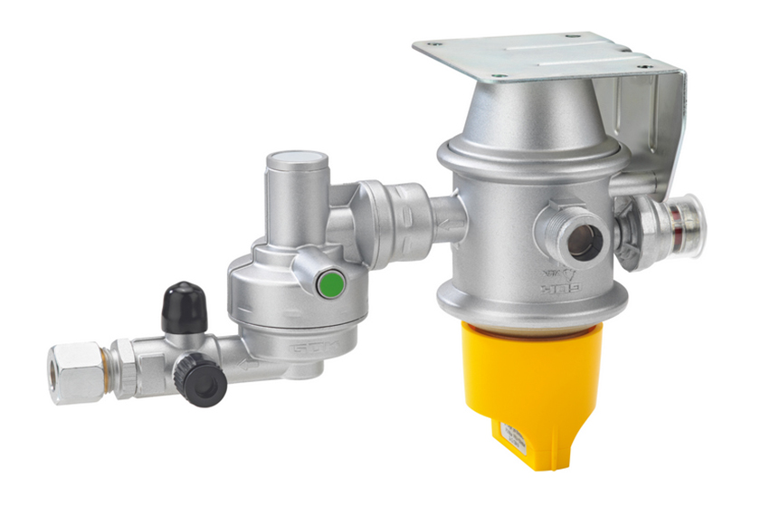 - automatischem Umschaltventil - Niederdruckregler mit Sicherheitsabblaseventil PRV - mechanischem Crash-Sensor - Bedienknopf - Betriebs- und Reserveanzeige - Gasrücktrittsicherung - Prüfeinrichtung und Wandhalterung