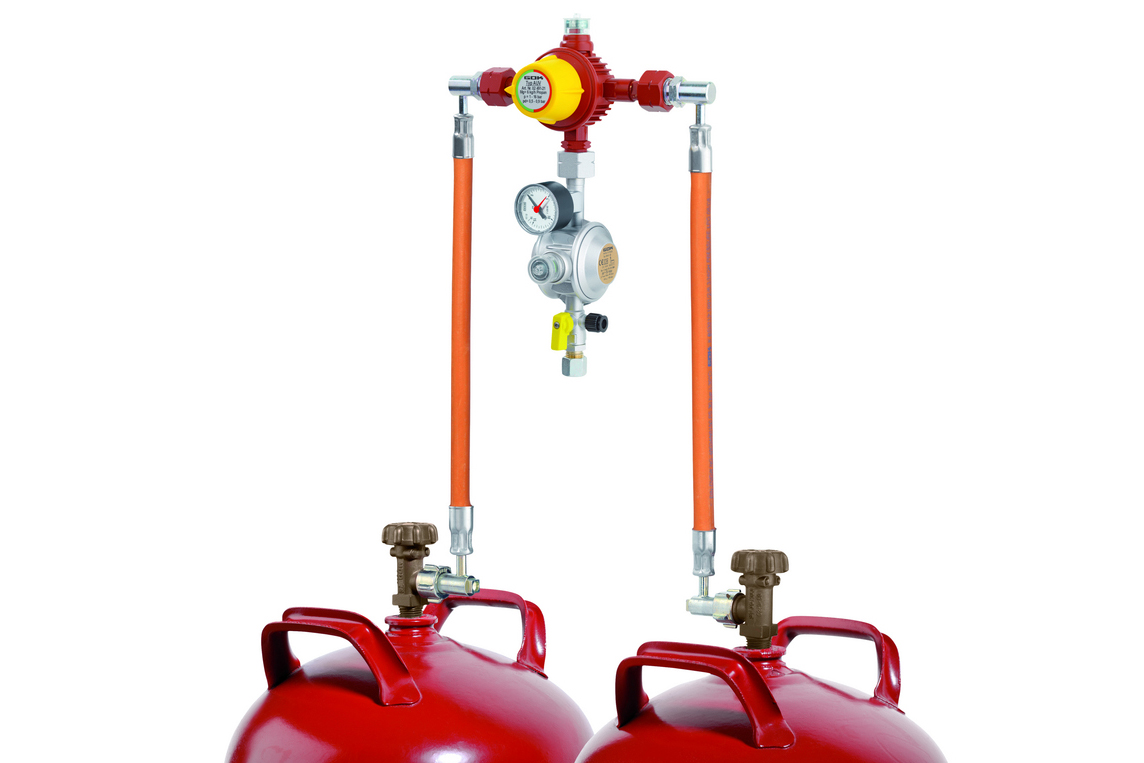 automatische Zweiflaschenanlage PS 16 bar (50 mbar - 1,5 kg/h) mit automatische Umschallteinrichtung, zum Anschluss an Gasflaschen, zur Druckregelung auf den Nenndruck des Gasgeräte.