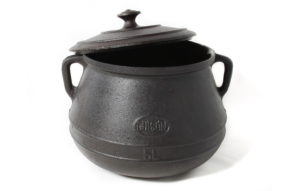 - mit massiven Griffen aus Gusseisen (zum Aufhängen über offenen Feuer geeignet)