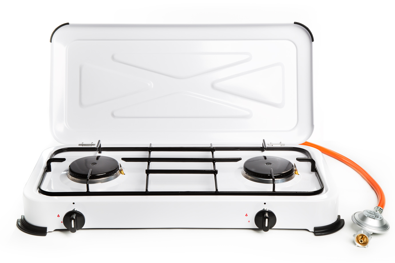Zweiflammen Gaskocher mit emaillierten Brennerdeckeln und Zündsicherung