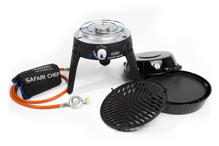 Vielseitig und tragbarer Gasgrill mit einem Gewicht von nur 4 kg und fünf austauschbaren Grillflächen: Campingkocher, Grillrost, antihaftbeschichtete und beidseitig verwendbare Grillplatte mit gerippter und glatter Seite sowie ein Wok der auch als Deckel verwendbar ist. Zum Transport werden alle Teile in einer praktischen Tasche verstaut. Der Safari Chef ist ein idealer Begleiter beim Campen, Wandern, Angeln, im Wohnwagen und bei Sportveranstalltungen.
