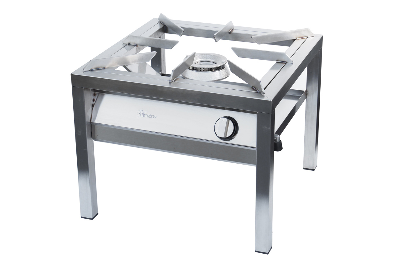Hochwertiger Erdgas-Hockerkocher in sehr massiver Edelstahlausführung, hoch belastbaren Topträgern, Zündbrenner und Zündsicherung.