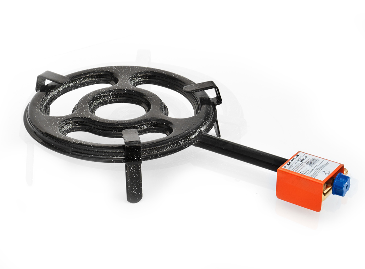 Hochwertiger emaillierter Ringbrenner / Paella-Gasbrenner (12,55 kW) mit Zündsicherung, incl. Schlauch und Regler zur Zubereitung leckerer spanischer Reisgerichte (Paella) oder Pfannengerichte.
