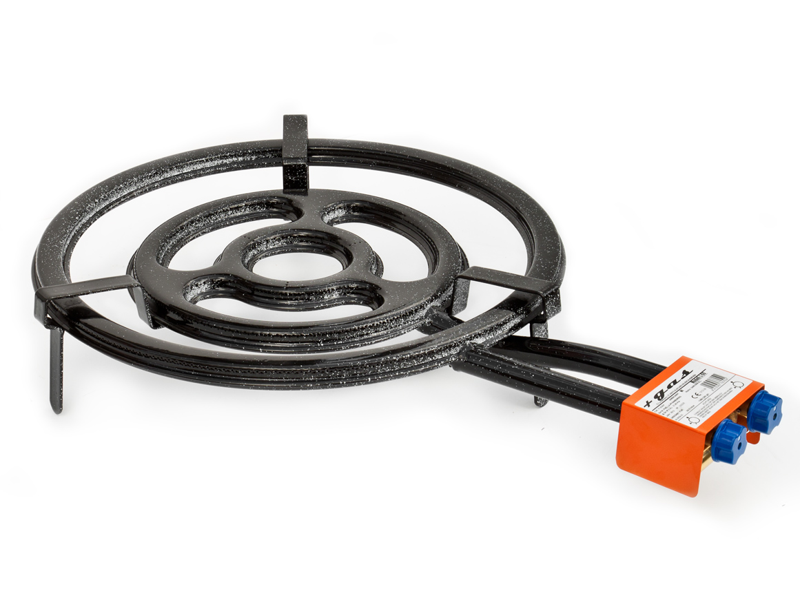 Hochwertiger emaillierter Ringbrenner / Paella-Gasbrenner (25,35 kW) mit Zündsicherung , incl. Schlauch und Regler zur Zubereitung leckerer spanischer Reisgerichte (Paella) oder Pfannengerichte.