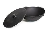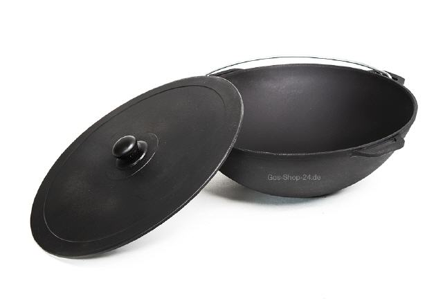 Massive Gusseisen-Wok Pfanne (Kasan) mit Gusseisen Deckel für die Verwendung auf einem Wok-Gaskocher oder offenem Feuer.