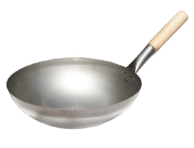 Hochwertige Wokpfanne mit rundem Boden und einen Pfannen-Durchmesser von 33 cm .